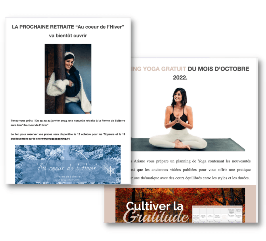 Inscrivez-vous à la Newsletter YogaCoaching, la Lettre Yoga, pour recevoir en avant-première les annonces d'ouverture des retraites mais également vos plannings gratuits de Yoga et toutes les informations sur YogaCoaching.